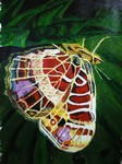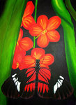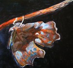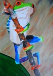 2010Schilderij in acryl van rode ibis voor een groene achtergrond.